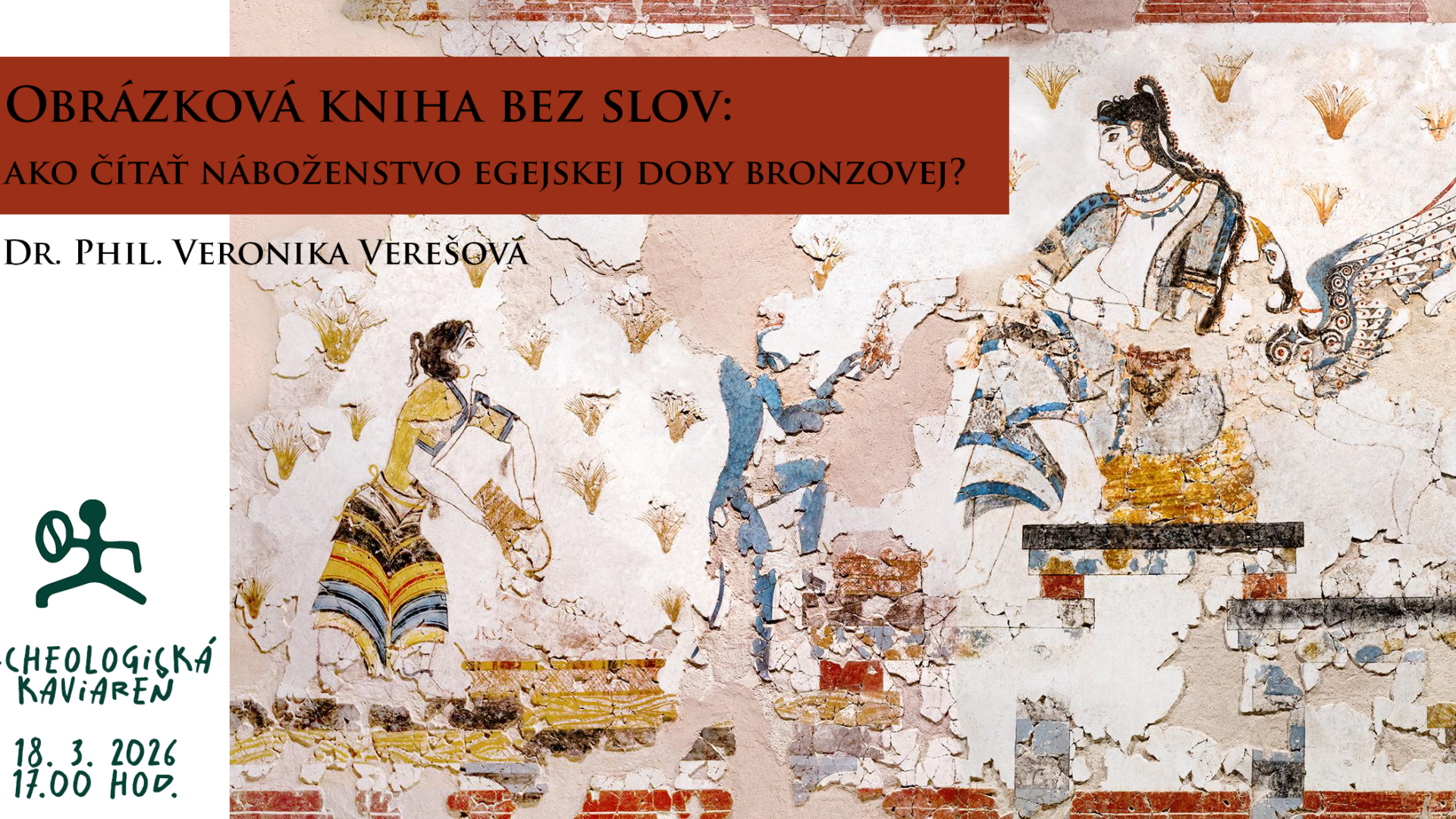Tajuplným svetom egejského náboženstva nás prevedie Dr. Phil. Veronika Verešová, ktorá je absolventkou klasickej archeológie Trnavskej univerzity a egyptológie na Viedenskej univerzite, doktorát získala na Inštitúte klasickej archeológie Viedenskej univerzity. Je členkou správnej rady Nadácie Aigyptos a vedeckou pracovníčkou Ústavu orientalistiky SAV. Zaoberá sa predovšetkým egejskou dobou bronzovou, 2. Prechodným obdobím a Novou ríšou v Egypte, dejinami a materiálnou kultúrou a medzikultúrnymi vzťahmi vo východnom Stredomorí doby bronzovej. Od roku 2008 je členkou poľsko-slovenskej misie na lokalite Tell el-Retábí.